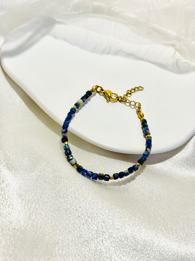 Bransoletka z kosteczek Lapis Lazuli, zachwycająca głębokim, intensywnym kolorem. Subtelna, elegancka i uniwersalna — świetnie komponuje się z innymi dodatkami.