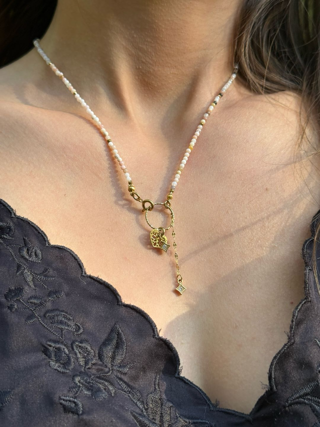 Subtelny naszyjnik z opalu peruwiańskiego 🌈, wykonany z bardzo drobnych kamieni (ok. 2 mm), ozdobiony wiszącymi zawieszkami 💕 – kamienie wspierają intuicję 🔮, pozytywną energię ✨ i spokój 🕊.