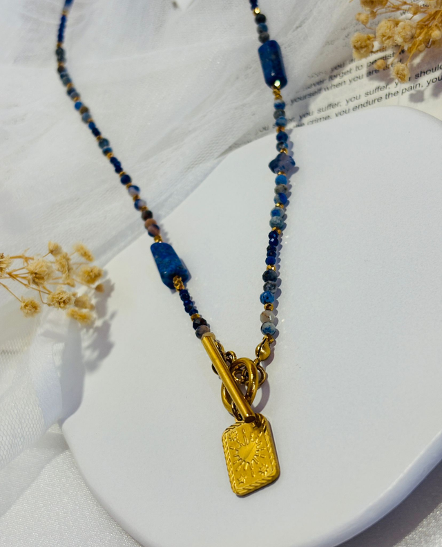 Naszyjnik z naturalnego lapis lazuli w wersji premium – kamienia o głębokim, królewskim odcieniu niebieskiego, który od wieków symbolizuje mądrość i duchową harmonię. Złota, prostokątna zawieszka z serduszkiem dodaje mu subtelnej elegancji i wyjątkowego charakteru.
