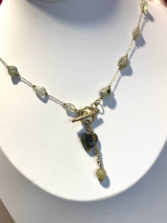 Delikatna asymetria natury zamknięta w lekkiej formie. Ten wyjątkowy naszyjnik wykonany ręcznie z nieregularnych kamieni frenitu to subtelny manifest kobiecej energii i harmonii. Zapięcie typu toggle z przodu zdobi zawieszka z labradorytu w kształcie serca oraz drobny kamyczek amazonitu, tworząc intrygującą kompozycję barw i faktur.