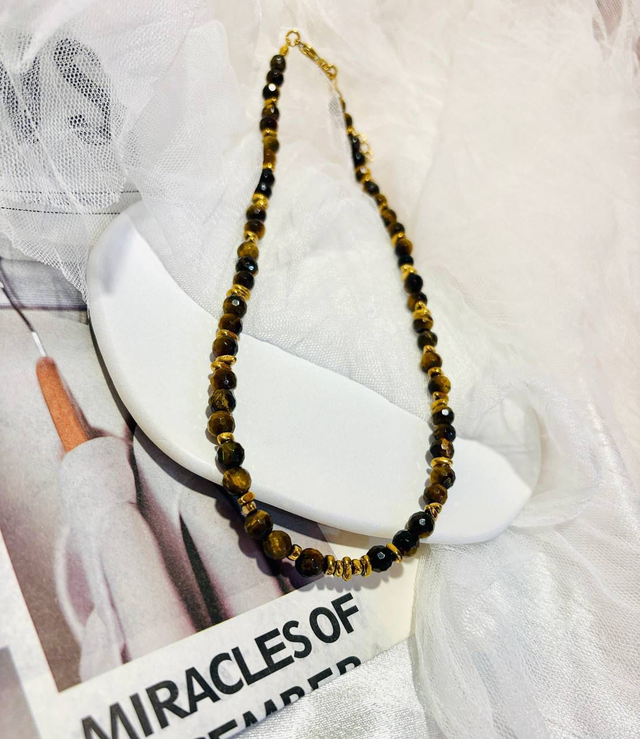 Naszyjnik z tygrysiego oka i hematytu — kamienie ochronne i wzmacniające koncentrację. Połysk tygrysiego oka przyciąga wzrok, hematyt stabilizuje aurę.