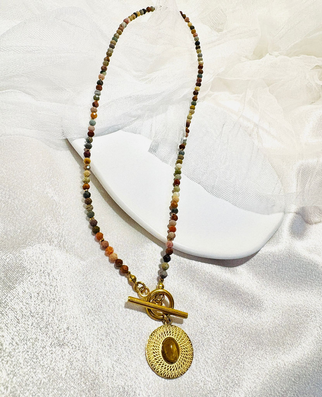 Delikatny naszyjnik wykonany z pastelowego agatu, ozdobiony zawieszką z Tygrysiego Oka, która dodaje mu wyjątkowego charakteru i subtelnego blasku. Idealny do codziennych, lekkich stylizacji oraz do łączenia z innymi naszyjnikami.