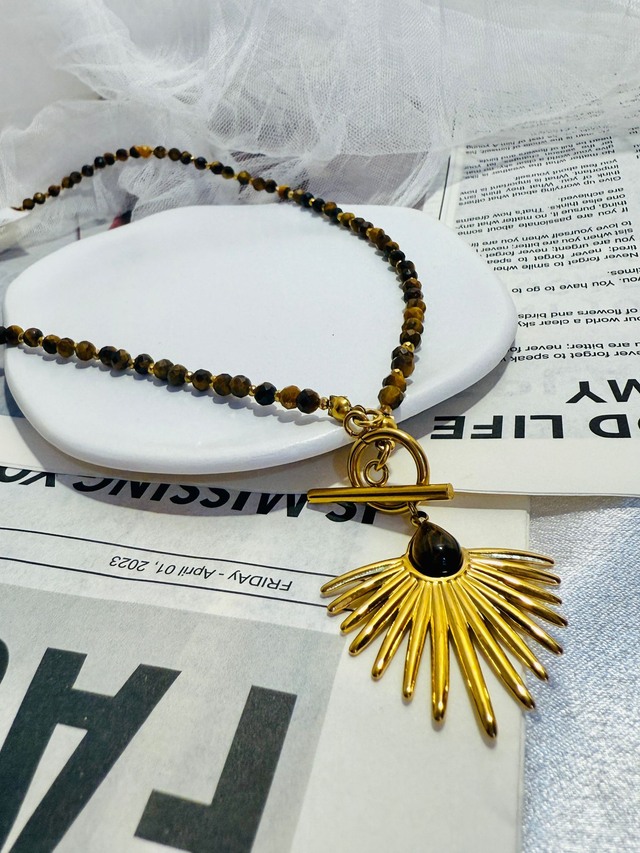 Naszyjnik z tygrysiego oka z zapięciem typu toggle z przodu. Zawieszka w kamieniu tygrysiego oka dodaje harmonii i stabilności duszy.