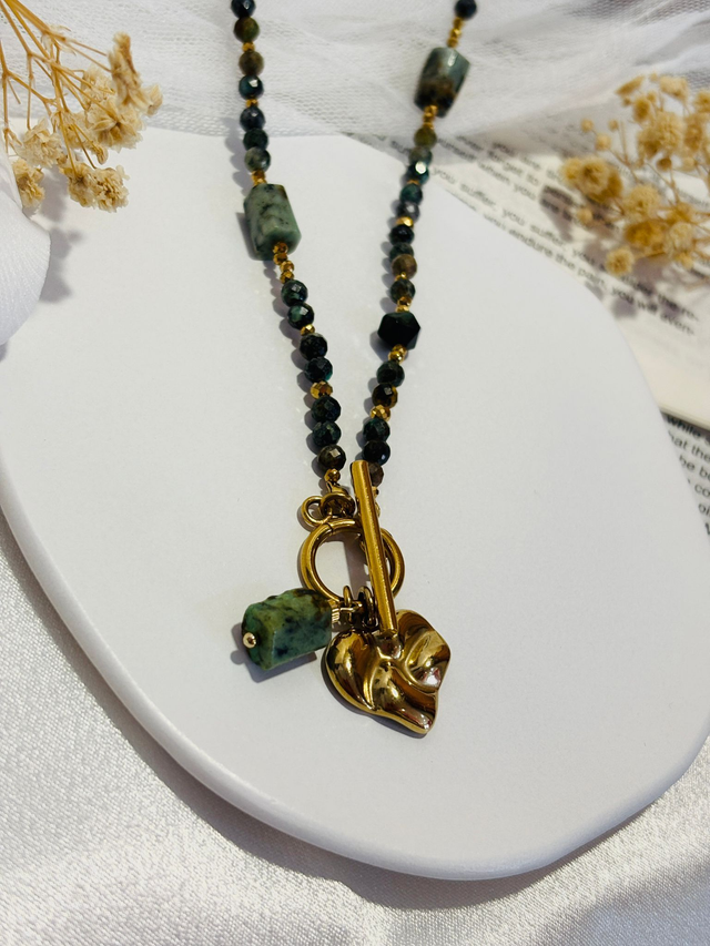 Unikatowe połączenie turkusu afrykańskiego i jaspisu zielonego w wersji premium. To kamienie o wyjątkowej jakości, starannie wyselekcjonowane, które nadają naszyjnikowi szlachetnego charakteru. Model stworzony dla osób, które cenią sobie oryginalność i elegancję w naturalnym wydaniu.